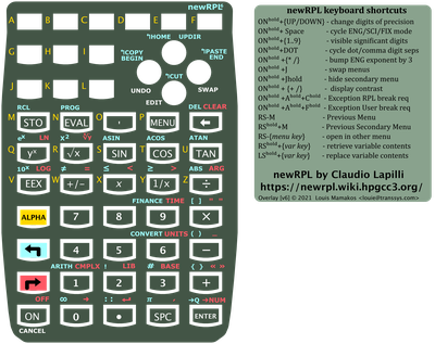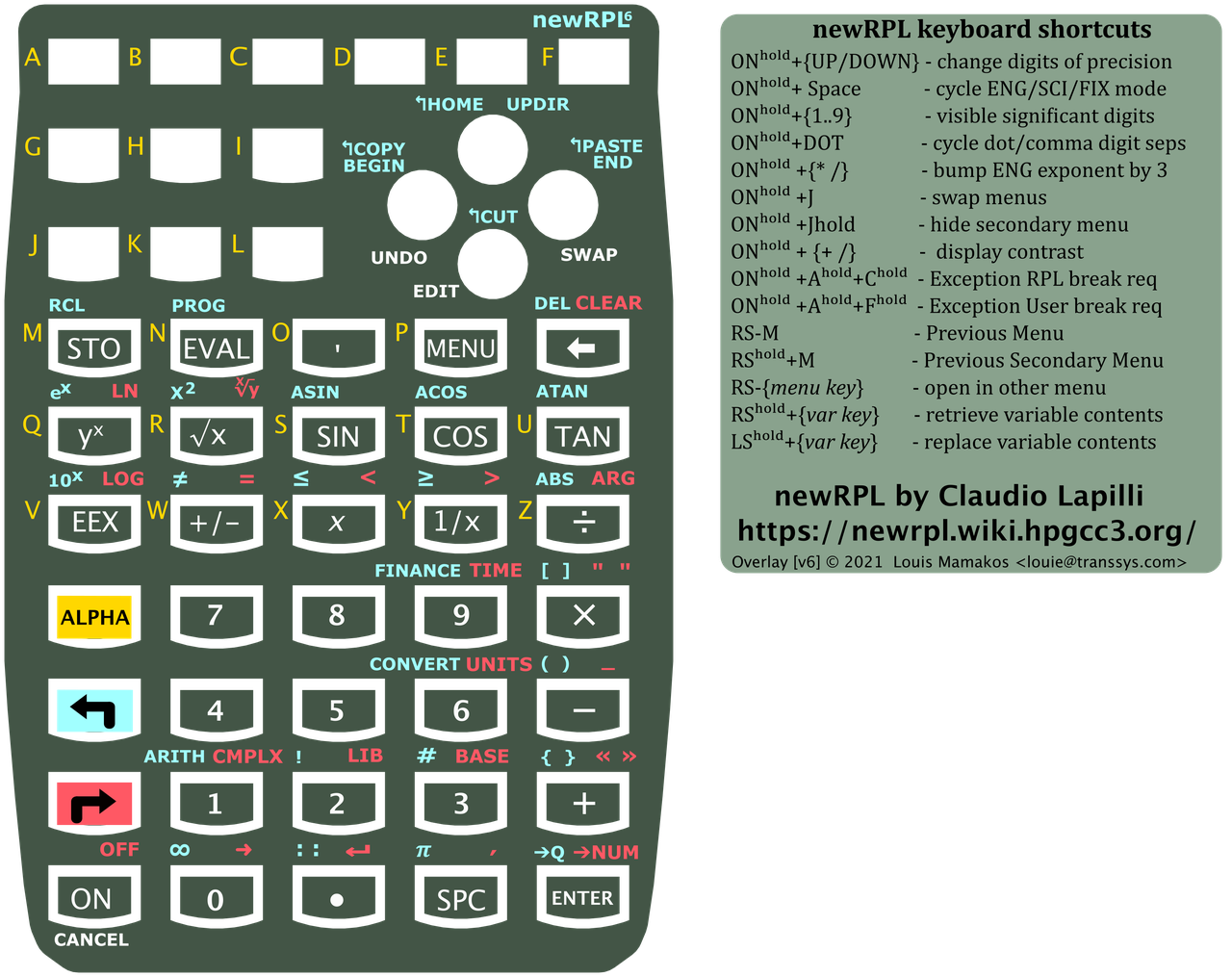 I've incorporated some suggestions in the thread in the overlay. I've also added another label intended to be stuck on the back of the calculator, sized to fit in the shallow recess that has the serial number sticker. This mostly contains the various ON-hold key combinations that may not be used as frequently, but are helpful.