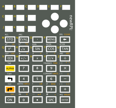 After using newRPL with a handy printed mock-up of the keyboard nearby, I decided to design a keyboard overlay with updated legends to match how newRPL works. I used OpenSCAD to produce an outline with all of the keyboard holes in the right places (or at least pretty close!) I then imported that as a layer in Inkscape to add legends around each key for the left- and right-shifted functions as well as alpha characters. The key tops also have correct labels, too.
