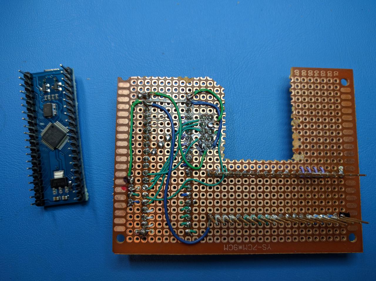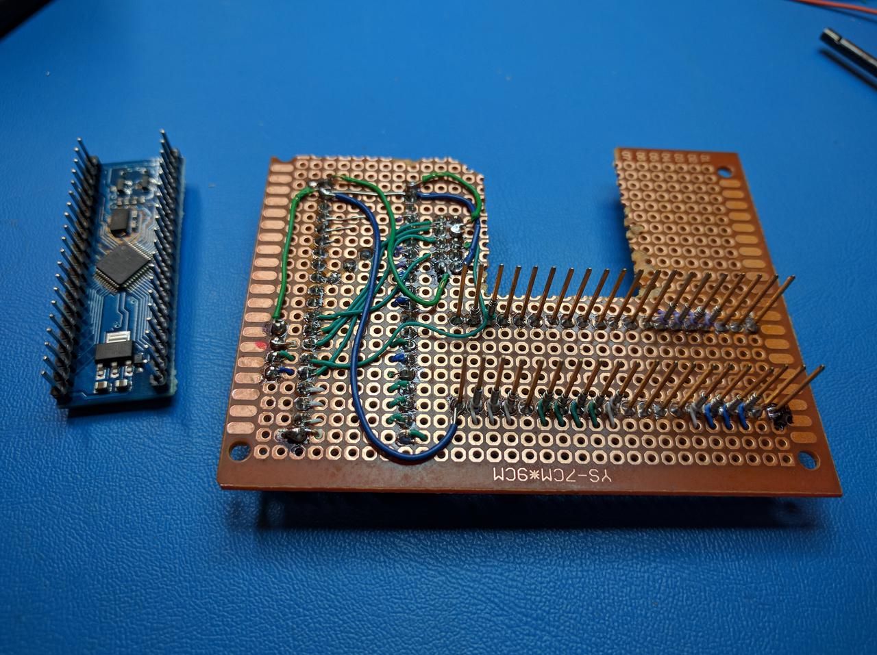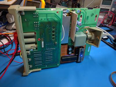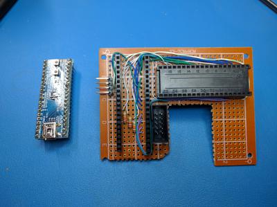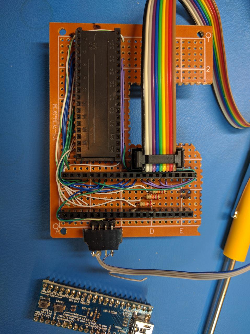 So instead a circuit was constructed on a small prototyping board. It included a 2 20 pin headers to accept the Maple Mini board, and a 40 pin "wire-wrap" style socket which has long pins. The 3870 CPU was removed from its socket, and the wire wrap socket pins are plugged into the Fluke's socket and the 3870 CPU inserted into the wire-wrap socket. This now provides easy access to all the signals on the Fluke's 3870 CPU (including Ground and -5V DC for power).